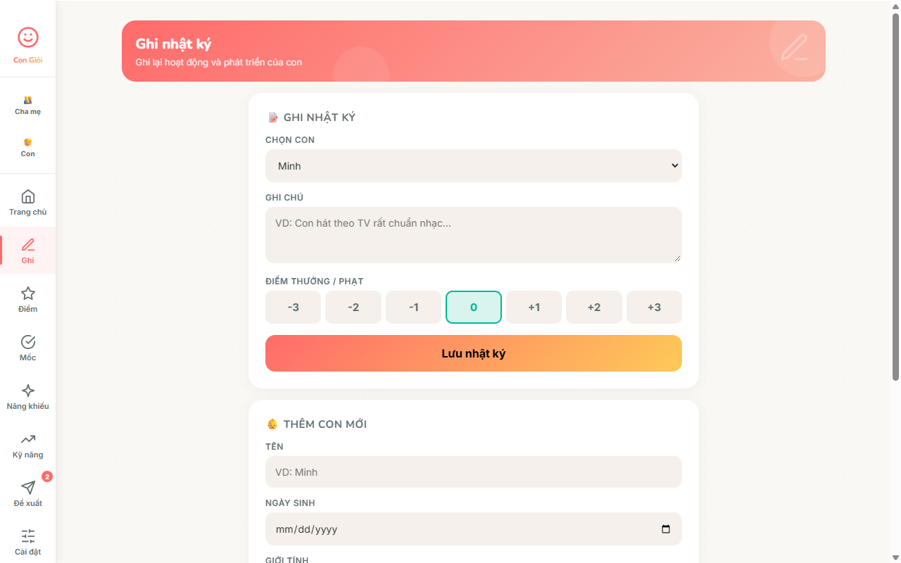 Đây là tính năng bạn sẽ dùng hàng ngày — ghi lại những điều con làm tốt hoặc chưa tốt, kèm điểm thưởng/phạt. Chỉ mất 30 giây mỗi lần ghi.