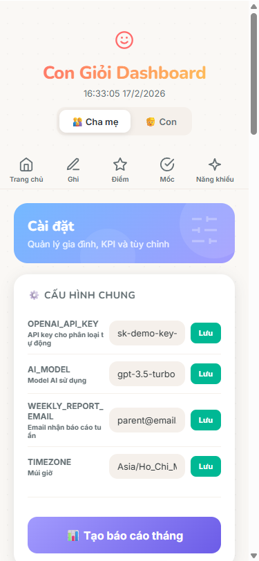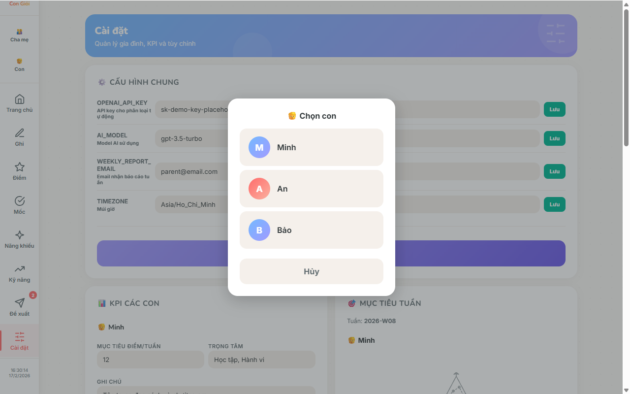 Một trong những tính năng đặc biệt nhất của Con Giỏi là hệ thống hai chế độ giao diện: Cha mẹ thấy toàn bộ dữ liệu và quyền quản trị; Con chỉ thấy thông tin phù hợp và giao diện thân thiện với trẻ.