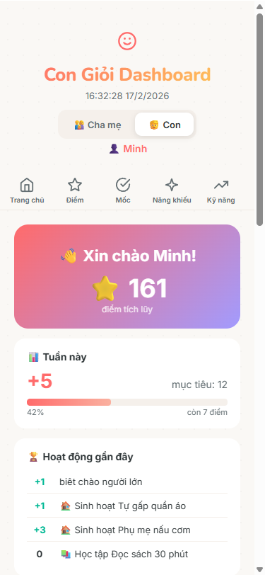 - Lời chào cá nhân — “Xin chào Minh! Hôm nay con có 12 sao ⭐”