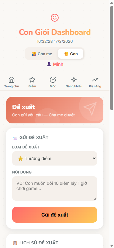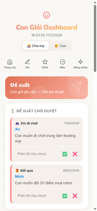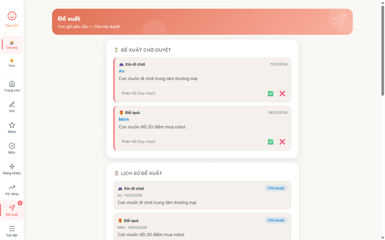 Đây là tính năng độc đáo nhất của Con Giỏi — một kênh giao tiếp chính thức giữa con và cha mẹ. Con có thể gửi đề xuất, cha mẹ xem xét và phản hồi. Giúp con học cách diễn đạt nhu cầu và cha mẹ hiểu con hơn.